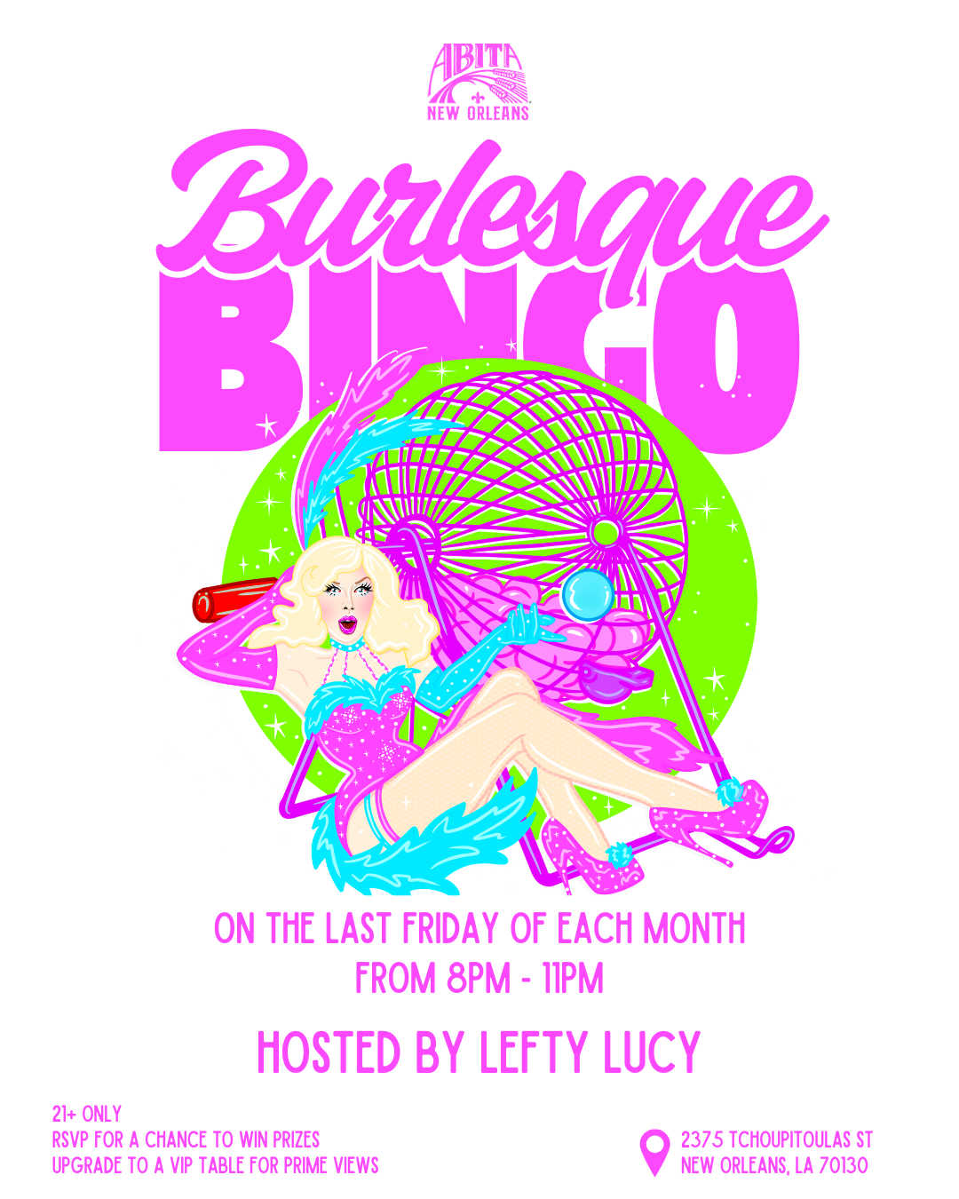 Bingo just got a whole lot sassier. Join us for Burlesque Bingo at Abita New Orleans, hosted by the fabulous Lefty Lucy — a cheeky, PG-13 mix of comedy, cabaret, and prizes that’ll keep you entertained all night long.