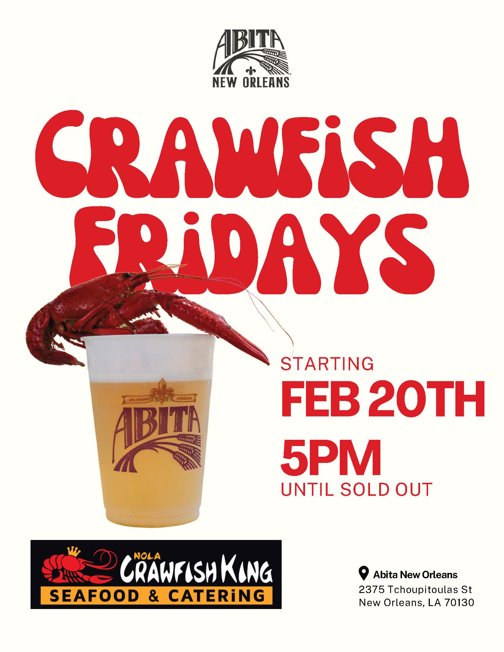 Kick off the season Friday, February 20th and make it a weekly ritual. Grab a cold Abita, peel a little, laugh a lot, and settle into your new favorite Friday tradition.